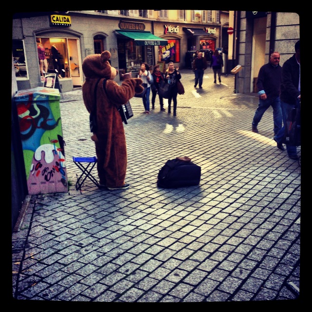 Find your moment of Zen which can be something really strange or funny that you witness.  It can also be a really wonderful, serendipitous moment. One day I saw an accordion player in Lausanne, Switzerland wearing a bear outfit . . .  oh là là. . .my moment of Zen! There is a musician who is often in our town square of Pully, Switzerland who plays the song, Moon River, which you may know from the movie Breakfast at Tiffany’s. This was my parent’s love song and always makes my heart happy. . . wonderfully serendipitous.